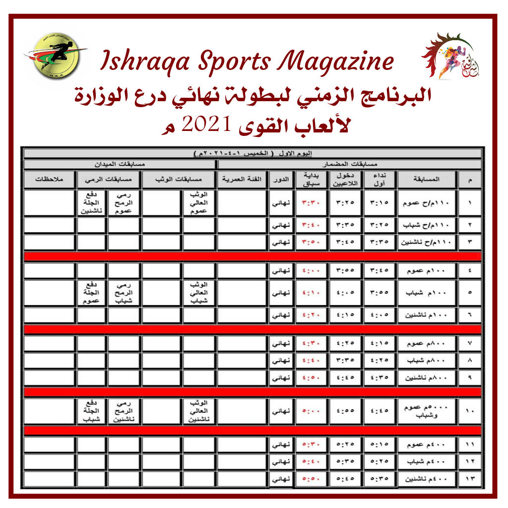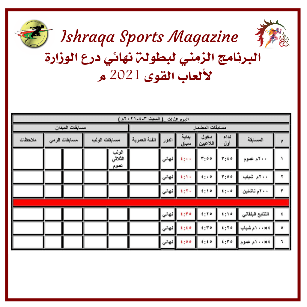 مجلة إشراقة الرياضية Ishraqa Sports Magazine غير مصنف 28 مارس، 2021 1 Minute البرنامج الزمني لبطولة نهائي درع الوزارة لألعاب القوى 2021 م. شارك هذا الموضوع: النقر للمشاركة على X (فتح في نافذة جديدة) X انقر للمشاركة على فيسبوك (فتح في نافذة جديدة) فيس بوك إعجاب تحميل... مرتبط نُشر بواسطة Ishraqa Sports Magazine حيث نلتقي بالأبطال المخضرمين الذين التحقو بالمنتخب ومثلو الوطن في جميع المحافل الدولية والعربية والخليجية والمحلية مشاهدة كل التدوينات بواسطة Ishraqa Sports Magazine منشور 28 مارس، 2021