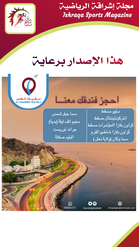 أبطال السلطنة في ألعاب القوى بدورة الألعاب الأولمبية طوكيو2020م Ishraqa Sports Magazine غير مصنف 26 جويلية، 2021 1 Minute الإصدار الشهري العدد الخامس عشر الاثنين 26 يوليو 2021م شارك هذا الموضوع: النقر للمشاركة على X (فتح في نافذة جديدة) X انقر للمشاركة على فيسبوك (فتح في نافذة جديدة) فيس بوك إعجاب تحميل... مرتبط نُشر بواسطة Ishraqa Sports Magazine حيث نلتقي بالأبطال المخضرمين الذين التحقو بالمنتخب ومثلو الوطن في جميع المحافل الدولية والعربية والخليجية والمحلية مشاهدة كل التدوينات بواسطة Ishraqa Sports Magazine منشور 26 جويلية، 2021
