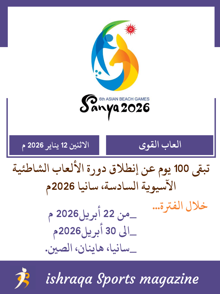 📍دورة الألعاب الشاطئية الآسيوية السادسة، سانيا 2026 م Ishraqa Sports Magazine غير مصنف 12 جانفي، 2026 1 Minute شارك هذا الموضوع: المشاركة على X (فتح في نافذة جديدة) X شارك على فيسبوك (فتح في نافذة جديدة) فيس بوك إعجاب تحميل... مرتبط نُشر بواسطة Ishraqa Sports Magazine حيث نلتقي بالأبطال المخضرمين الذين التحقو بالمنتخب ومثلو الوطن في جميع المحافل الدولية والعربية والخليجية والمحلية مشاهدة كل التدوينات بواسطة Ishraqa Sports Magazine منشور 12 جانفي، 2026
