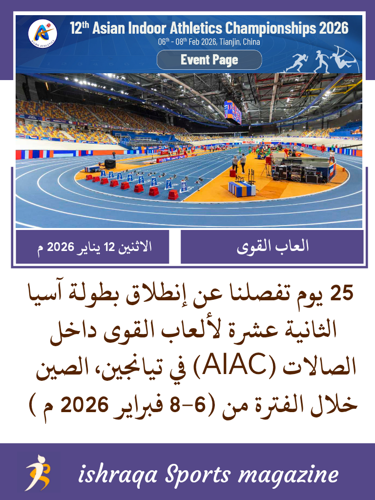 25 يوم تفصلنا عن إنطلاق بطولة آسيا الثانية عشرة لألعاب القوى داخل الصالات (AIAC) في تيانجين، الصين (6-8 فبراير 2026) Ishraqa Sports Magazine غير مصنف 12 جانفي، 2026 1 Minute شارك هذا الموضوع: المشاركة على X (فتح في نافذة جديدة) X شارك على فيس بوك (فتح في نافذة جديدة) فيس بوك إعجاب تحميل... مرتبط نُشر بواسطة Ishraqa Sports Magazine حيث نلتقي بالأبطال المخضرمين الذين التحقو بالمنتخب ومثلو الوطن في جميع المحافل الدولية والعربية والخليجية والمحلية مشاهدة كل التدوينات بواسطة Ishraqa Sports Magazine منشور 12 جانفي، 2026