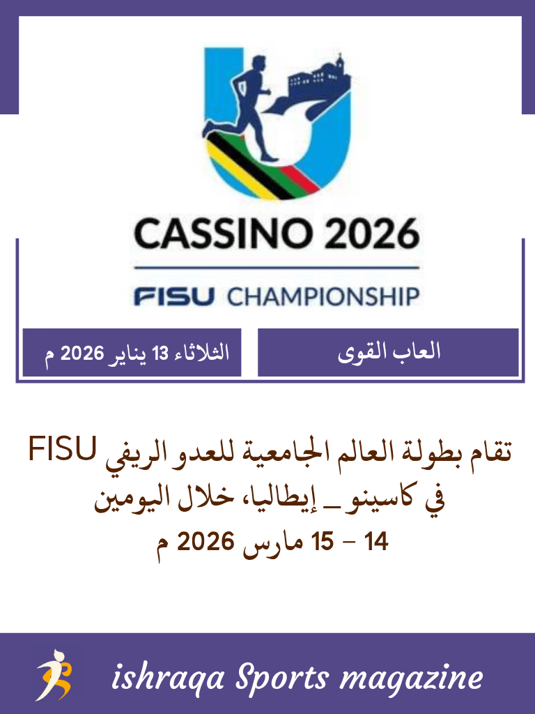 تقام بطولة العالم الجامعية للعدو الريفي FISU، في كاسينو _ إيطاليا، خلال اليومين 14 – 15 مارس 2026 م Ishraqa Sports Magazine غير مصنف 13 جانفي، 2026 1 Minute شارك هذا الموضوع: المشاركة على X (فتح في نافذة جديدة) X شارك على فيس بوك (فتح في نافذة جديدة) فيس بوك إعجاب تحميل... مرتبط نُشر بواسطة Ishraqa Sports Magazine حيث نلتقي بالأبطال المخضرمين الذين التحقو بالمنتخب ومثلو الوطن في جميع المحافل الدولية والعربية والخليجية والمحلية مشاهدة كل التدوينات بواسطة Ishraqa Sports Magazine منشور 13 جانفي، 2026